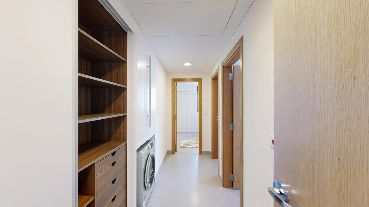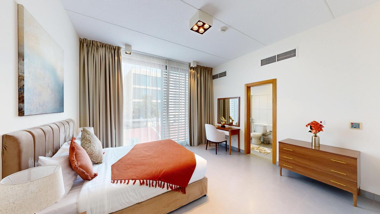 This apartment is designed to fit a small family and includes a master bedroom with a private bath and a second bedroom with adjacent bathroom.